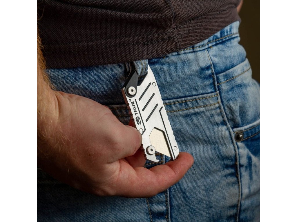 Praktický kapesní nožík Boxcutter TU 583K od značky True Utility je perfektní volbou pro každou situaci. Tělo nožíku je vyrobeno z nerezové oceli, díky tomu je velmi pevné a odolné. Chytře navržený kryt čepele zároveň slouží jako rukojeť. Na těle se dále nachází pojistka, tlačítko pro rychlé uvolnění a výměnu čepele a titanový klip, za který můžete nožík připnout ke klíčům či k batohu.