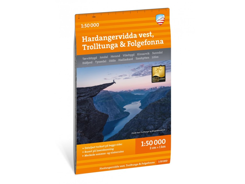Oboustraná turistická mapa v měřítku 1:50 000 pokrývá západní části národních parků Hardangervidda, Sørfjorden a Folgefonna s oblíbenými turistickými cíli, jako jsou Trolltunga, Søtefossen a Hårteigen (1690 m n. m.).