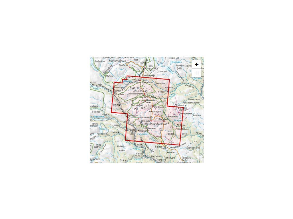 Mapa zahrnuje všechny nejoblíbenější horské oblasti, značené turistické trasy v oblasti, chaty DNT a soukromé ubytovací chaty. Zobrazuje značené letní trasy v oblasti a stejně dobře funguje i v zimě s vyznačenými zimními trasami a upravovanými lyžařskými stopami.