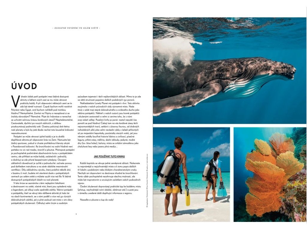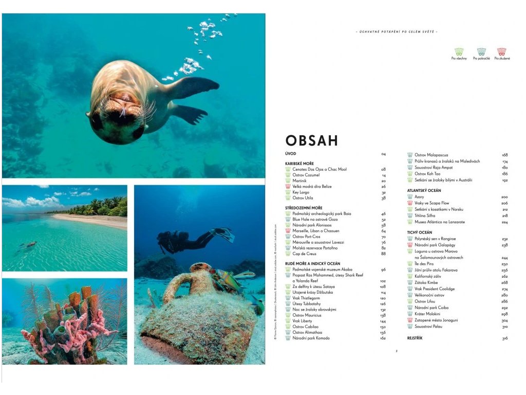 Pod hladinou, kde vládnou převážně odstíny modré a zelené, se ukrývá úchvatný svět. Objevte kolosální žraloky obrovské, korálové útesy pulzující životem, drobné mořské plže či tajuplné vraky. V této knize naleznete 50 výjimečných potápěčských míst, které se zaujetím popisují autorky a autoři vybaveni buďto tlakovými lahvemi, nebo pouhou maskou a šnorchlem, a dalších 150 zajímavých ponorů. Ať už jste potápěč začátečník, nebo zkušený odborník, najdete zde plno zajímavých lokalit k naplánování vlastního dobrodružství či k pouhému snění.